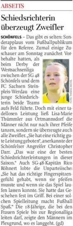 Unter den 210 Schiedsrichtern in Westsachsen gibt es gerade mal eine Handvoll Frauen. Der Kreisverband würde sich über Zuwachs freuen. "Voraussetzungen sind Interesse am Fußball, Sportlichkeit und eventuell eigene Erfahrungen als Spielerin, was aber keine Bedingung ist", erklärt Sebastian Schulz. Lisa-Marie Thümmler vom SV 1861 Ortmannsdorf liefert ein Beispiel dafür, dass ein guter Schiedsrichter nicht unbedingt auch aktiver Spieler gewesen sein muss. "Mein Bruder Franz spielt Fußball. Den habe ich oft zu den Spielen begleitet und war irgendwie von der Arbeit der Schiedsrichter begeistert", sagt sie. Über den Besuch von Lehrgängen eignete sie sich die nötigen theoretischen Voraussetzungen an und leitete im Alter von zwölf Jahren ihr erstes Spiel. "Beim Sammeln praktischer Fertigkeiten stand mir dann ein Betreuer zur Seite, der mir sehr geholfen hat." Bedenken, auf dem Platz auch schon mal eine Fehlentscheidung zu treffen, hat die 16-Jährige nicht. "Natürlich wurmt einen so was. Aber auch Schiedsrichter sind nur Menschen, und denen unterlaufen nun mal hin und wieder Fehler", sagt sie. Auch Lisa-Maries Erfahrungen, bei den Männern zu pfeifen, sind positiv. "Möglicherweise freuen sich einige Spieler sogar darüber, denn weibliche Schiedsrichter sind in unserer Region immer noch die Ausnahme, was aber nicht so bleiben muss."